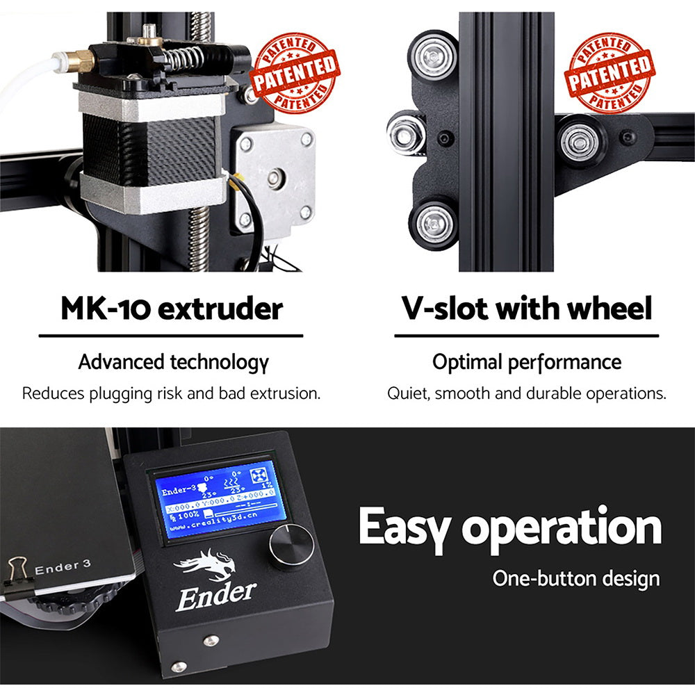 It is no more in the realm of science fiction. Realise your creativity and imagination with the Creality 3-D Printer. Simple to use and assemble, our 3-D printer makes for a high-precision printing process. Utilising advanced technology, the printer greatly reduces plugging risk and bad extrusion and a V-slot with POM wheels for quiet, smooth and durable operation. The LCD display allows you to set your printing parameters with minimum hassle and the printer is also designed to resume printing in the event of power outage. The heated build platform only takes 5 minutes to heat up to production temperature. Better still, the printer has a large printing volume to meet your requirements in more ways than one.