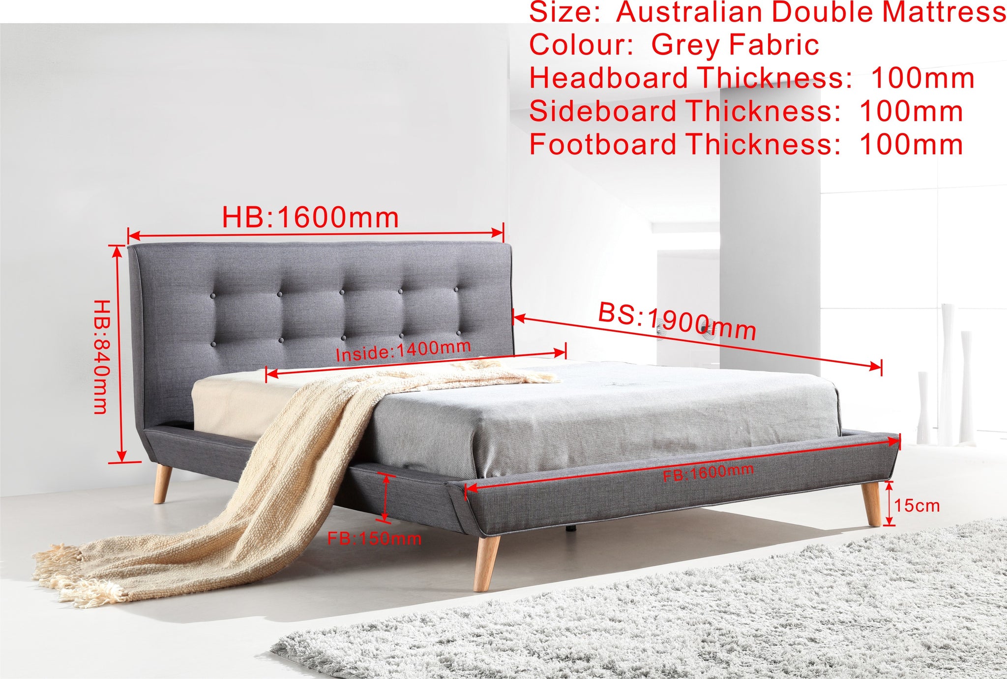 An exceptionally sturdy all-wood frame and support slats provide a rock-solid foundation for your mattress that will surely lead to many restful nights. The Linen Fabric covering is similarly durable, not to mention easy to clean. The frame is designed to accommodate standard Double-sized mattresses with dimensions of 137 x 187 cm (mattress and linens not included). The headboard is 99 cm tall (15cm leg & 84cm headboard) from top to bottom, and the overall dimensions of the bed frame are 190 cm x 160 cm.