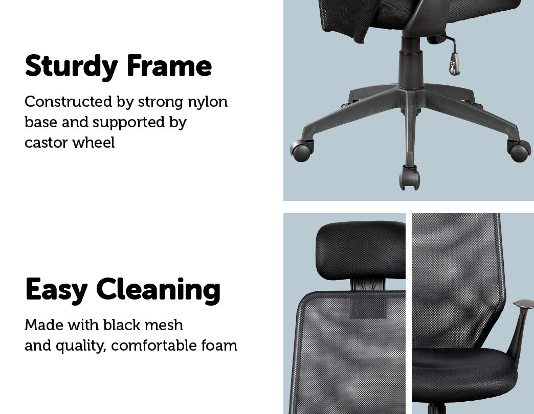 The chair is constructed with a black mesh for superior comfort which conforms to your back and spinal column, giving you the energy and proper support to power through the day. A dedicated headrest is perfect for leaning back and taking a little break. A convenient gaslift makes height easily adjustable from 118.5cm to 128.5cm. And a nylon base with 5 castor wheels provide an easy way to rotate and wheel around.