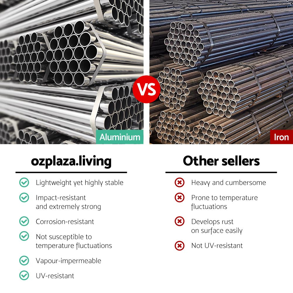 Comprising two unique chairs and an equally stunning table, the Set displays meticulous craftsmanship with great attention to details. The frames for chairs and table are all made of durable aluminium and designed to last in every weather condition. The extra thick 6mm high density foam on the seats deliver ultimate comfort. A bonus set of interchangeable cream covers is also included. The chairs also feature built-in handles whilst the tempered glass table top is a welcomed addition. Not least, the entire ensemble is conceived as a smart integrated design to save on storage space.