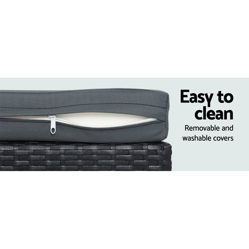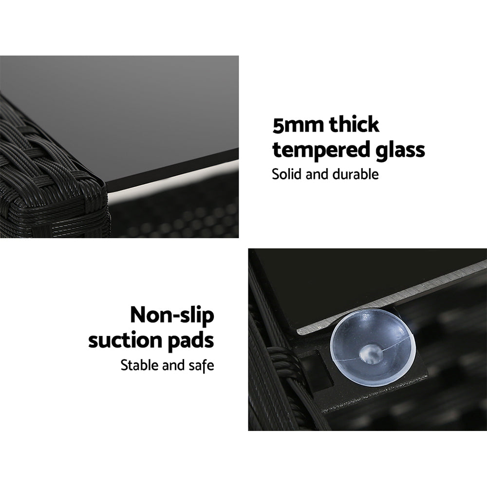 Meticulously crafted, our Gardeon 4-piece Rattan Outdoor Set comprises two armchairs, a two-seater and a matching table for a beautiful integrated look. Its presence will definitely add panache and style to your deck, patio or even living room. Made of handwoven UV-resistant PE wicker and a sturdy galvanised steel frame, this set not only looks stylish but is designed to last through all weather and the test of time. The 5mm thick tempered glass top with non-slip suction pads for the table also ensures strong and safe use with total peace of mind. Not least, the cushions and pillows on the seats are thick and well-padded to provide ultimate comfort and are suitable for all-weather use as well. And the covers are even removable and washable to maintain their pristine appearance. With so much going for it, the outdoor set certainly deserves its coveted space in your lovely backyard. Or even indoors for a unique presence.