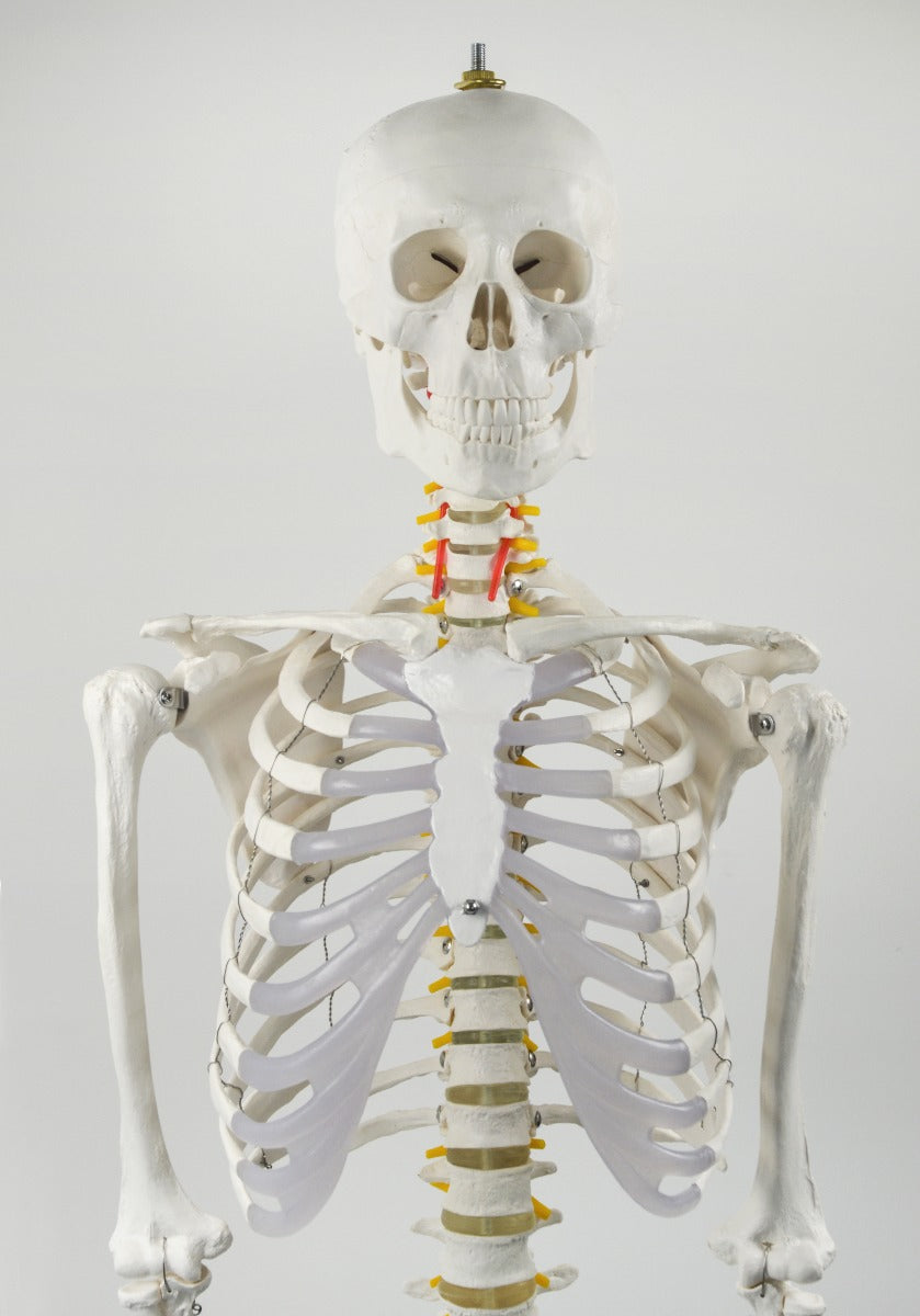 Uses for the adult life-sized skeleton are wide-ranging. According to need, it can be painted on, dressed in clothing and even drilled through. The life-like skeleton features visible nerve branches, a herniated lumbar disc and the vertebral artery.