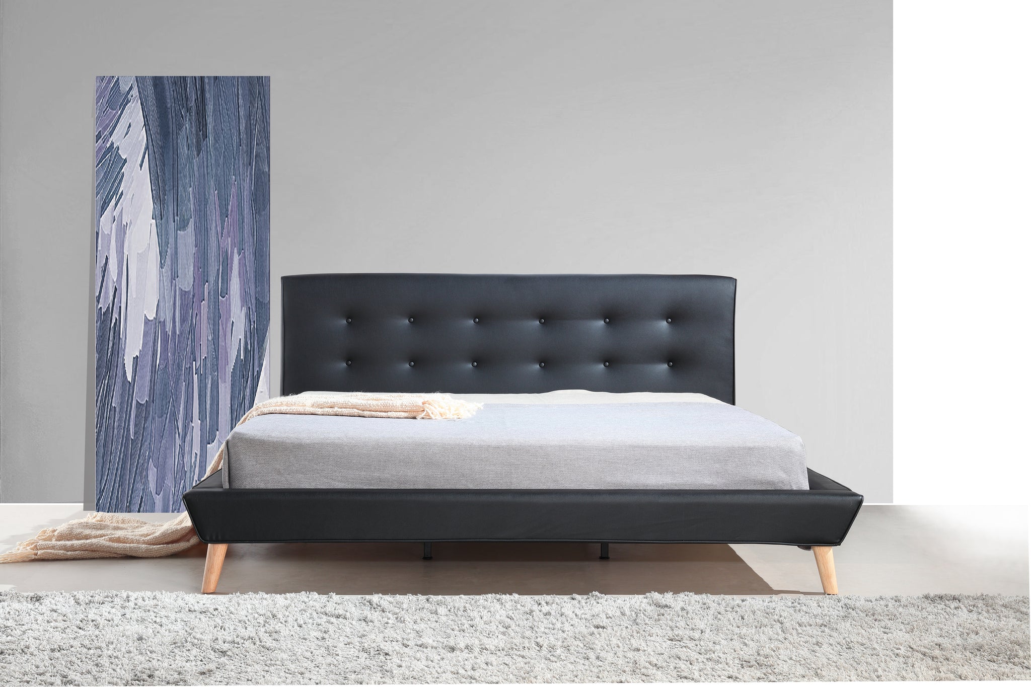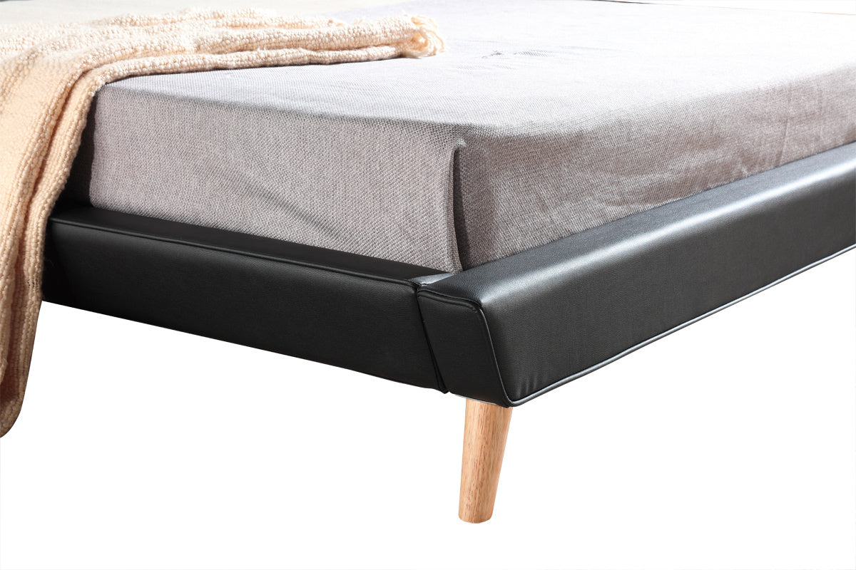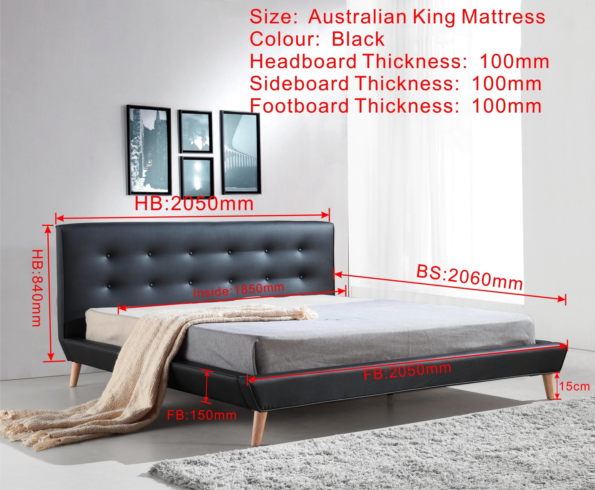 An exceptionally sturdy all-wood frame and support slats provide a rock-solid foundation for your mattress that will surely lead to many restful nights. The PU Leather covering is similarly durable, not to mention easy to clean. The frame is designed to accommodate standard King-sized mattresses with dimensions of 183 x 203 cm (mattress and linens not included). The headboard is 99 cm tall (15cm leg & 84cm headboard) from top to bottom, and the overall dimensions of the bed frame are 206 cm x 205 cm.