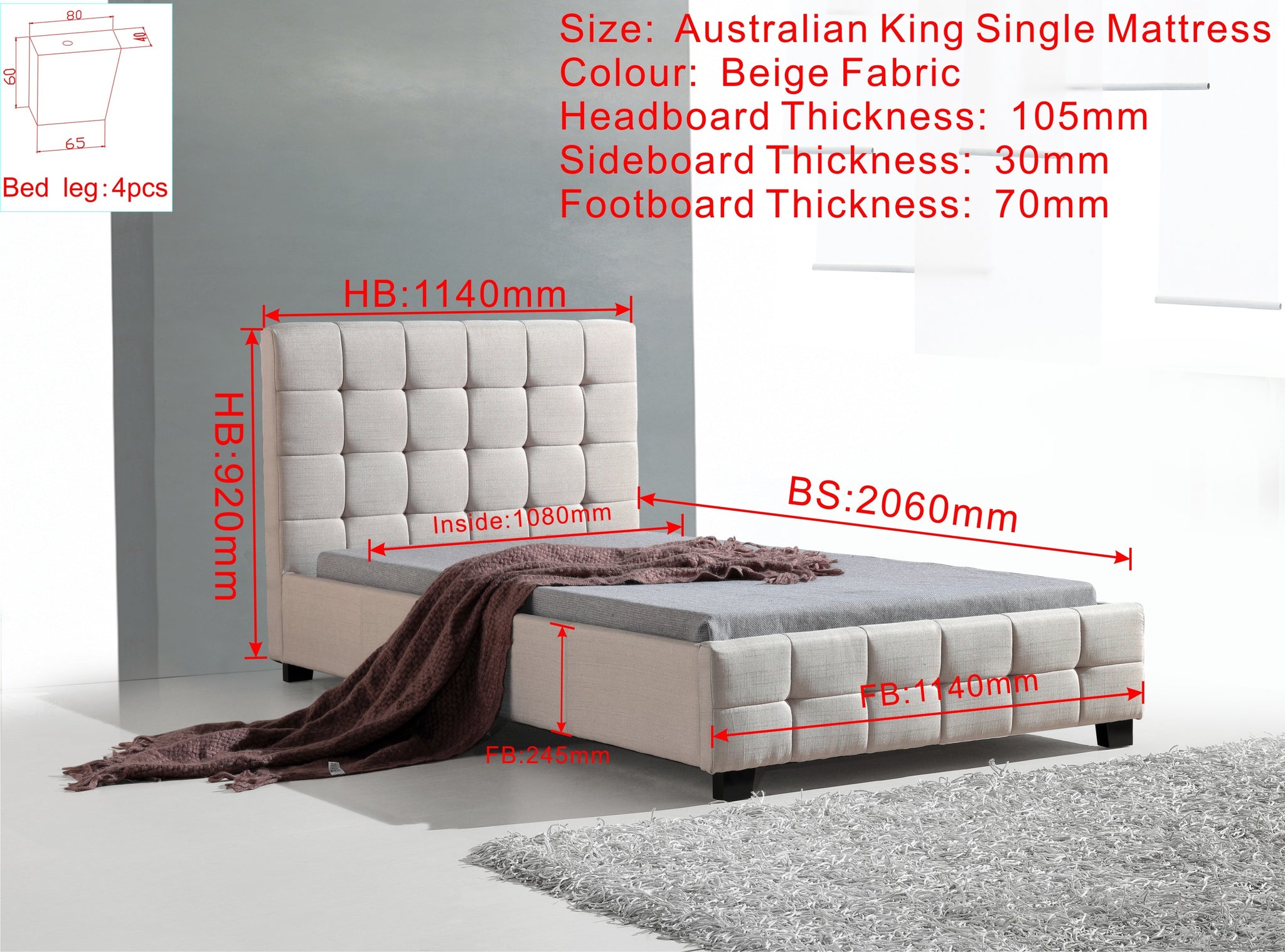 This bed from the expert craftspeople at Palermo measures 114 cm wide by 206 cm long, with a headboard that measures 88 cm tall (10cm leg & 78cm headboard) from top to bottom. It fits a king single mattress measuring 106 x 203 cm. The frame and headboard feature a durable Linen Fabric covering that's easy to clean and that will look great for many years to come. The headboard is padded for comfort while sitting up and reading or watching TV. An attractive stitched-together look and clean, simple lines make this bed frame a perfect complement to the modern bedroom. And the beige colour adds visual appeal without being ostentatious.