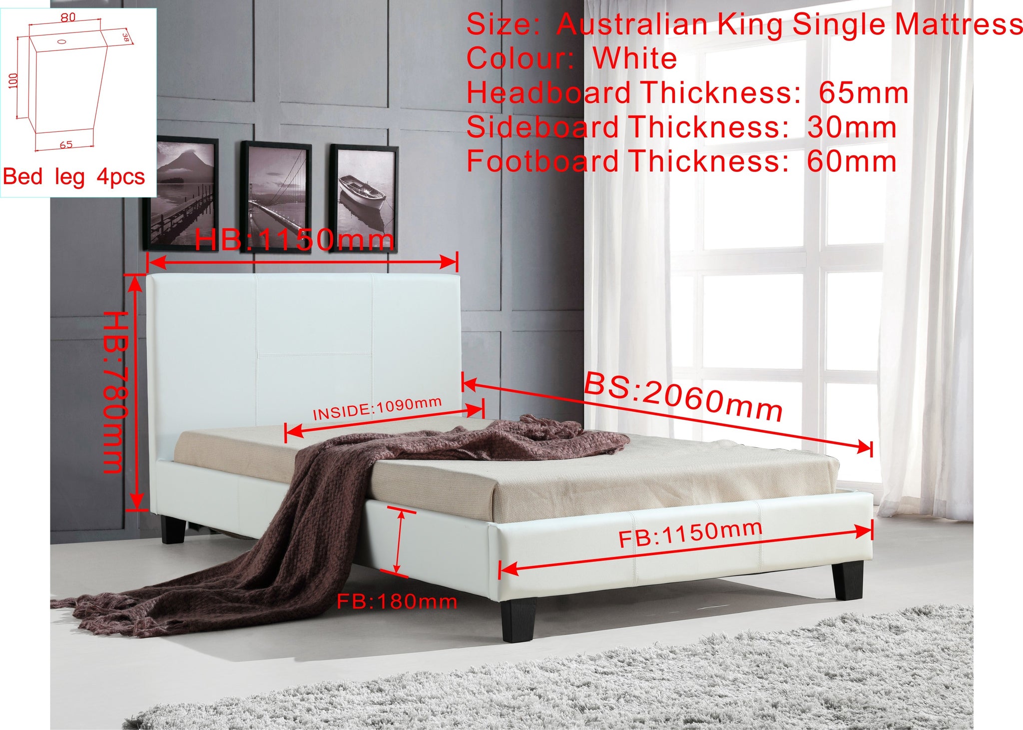 This bed from the expert craftspeople at Palermo measures 115 cm wide by 206 cm long, with a headboard that measures 88 cm tall (10cm leg & 78cm headboard) from top to bottom. It fits a king single mattress measuring 106 x 203 cm. The frame and headboard feature a durable PU Leather covering that's easy to clean and that will look great for many years to come. The headboard is padded for comfort while sitting up and reading or watching TV. An attractive stitched-together look and clean, simple lines make this bed frame a perfect complement to the modern bedroom. And the white colour adds visual appeal without being ostentatious.