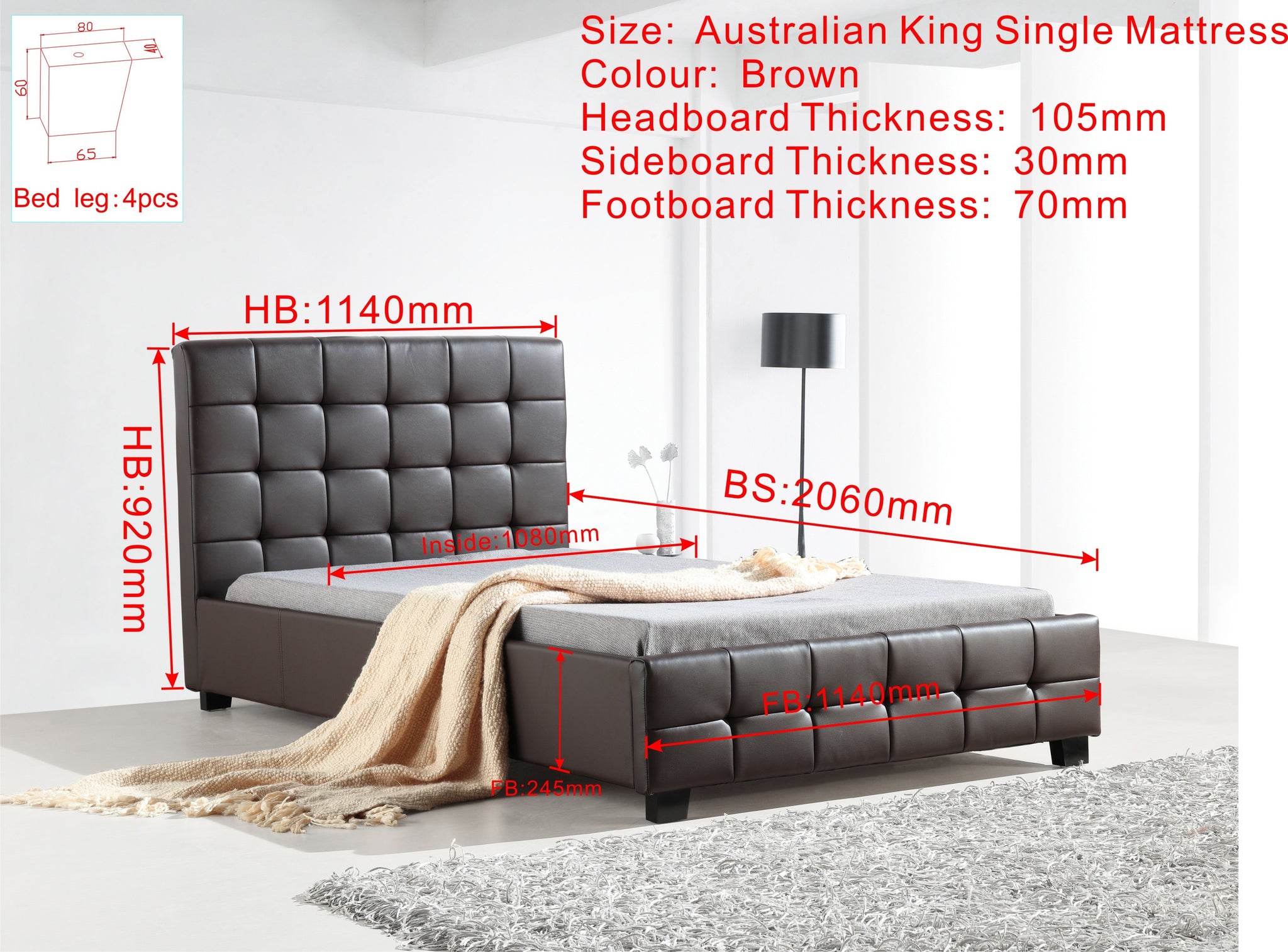 This bed from the expert craftspeople at Palermo measures 114 cm wide by 206 cm long, with a headboard that measures 88 cm tall (10cm leg & 78cm headboard) from top to bottom. It fits a king single mattress measuring 106 x 203 cm. The frame and headboard feature a durable PU Leather covering that's easy to clean and that will look great for many years to come. The headboard is padded for comfort while sitting up and reading or watching TV. An attractive stitched-together look and clean, simple lines make this bed frame a perfect complement to the modern bedroom. And the brown colour adds visual appeal without being ostentatious.