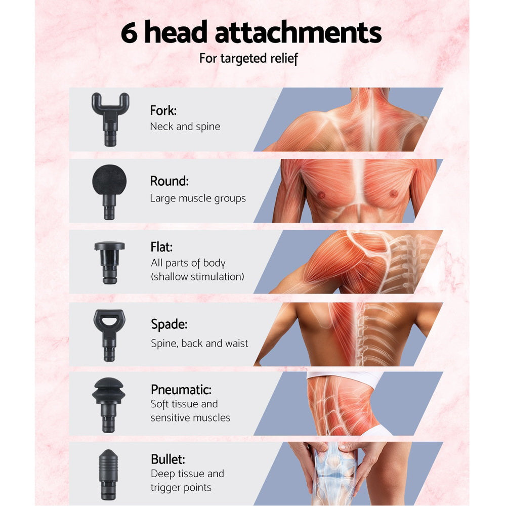 Chronic muscle pains? Hardcore gym junkie? Office job with long working hours? Recovering from an accident? Whatever your situation, our Percussion Massage Gun provides customised percussive therapy in the comfort of your own home, without the need to visit luxury spas or physiotherapists. The powerful 12V brushless high-torque motor with closed-loop control operates quietly and provides rapid bursts of pressure penetrating 12mm deep into your muscle tissues at up to 4000 percussions per minute. The massage gun is powered by a rechargeable lithium battery that lasts up to 8 hours so that you can forget to recharge once in a while and the non-slip rubber handle provides a comfortable grip to reduce hand fatigue. Percussion speed can be easily adjusted using the intuitive LCD display with smart touch controls and there are 10 speed levels to suit various purposes from simply waking up your muscles to decreasing lactic acid and accelerating muscle recovery after exercising, or even intense professional-level massages. And with the six interchangeable head attachments for targeted relief (round, fork, bullet, flat, Pneumatic and Spade heads), you are ensured of a fully customised massage.