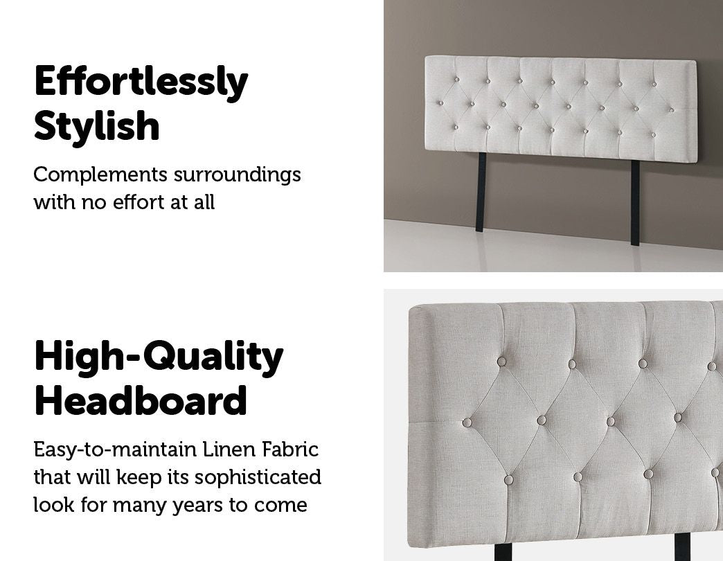 This headboard for standard Queen-sized bed frames is created with quality materials, including easy-to-maintain Linen Fabric that will maintain its sophisticated look for many years to come. This particular model comes with elegant stitching accents that provide just the right level of understated pop. A neutral beige will blend seamlessly with a wide variety of bed frames and other bedroom furniture.