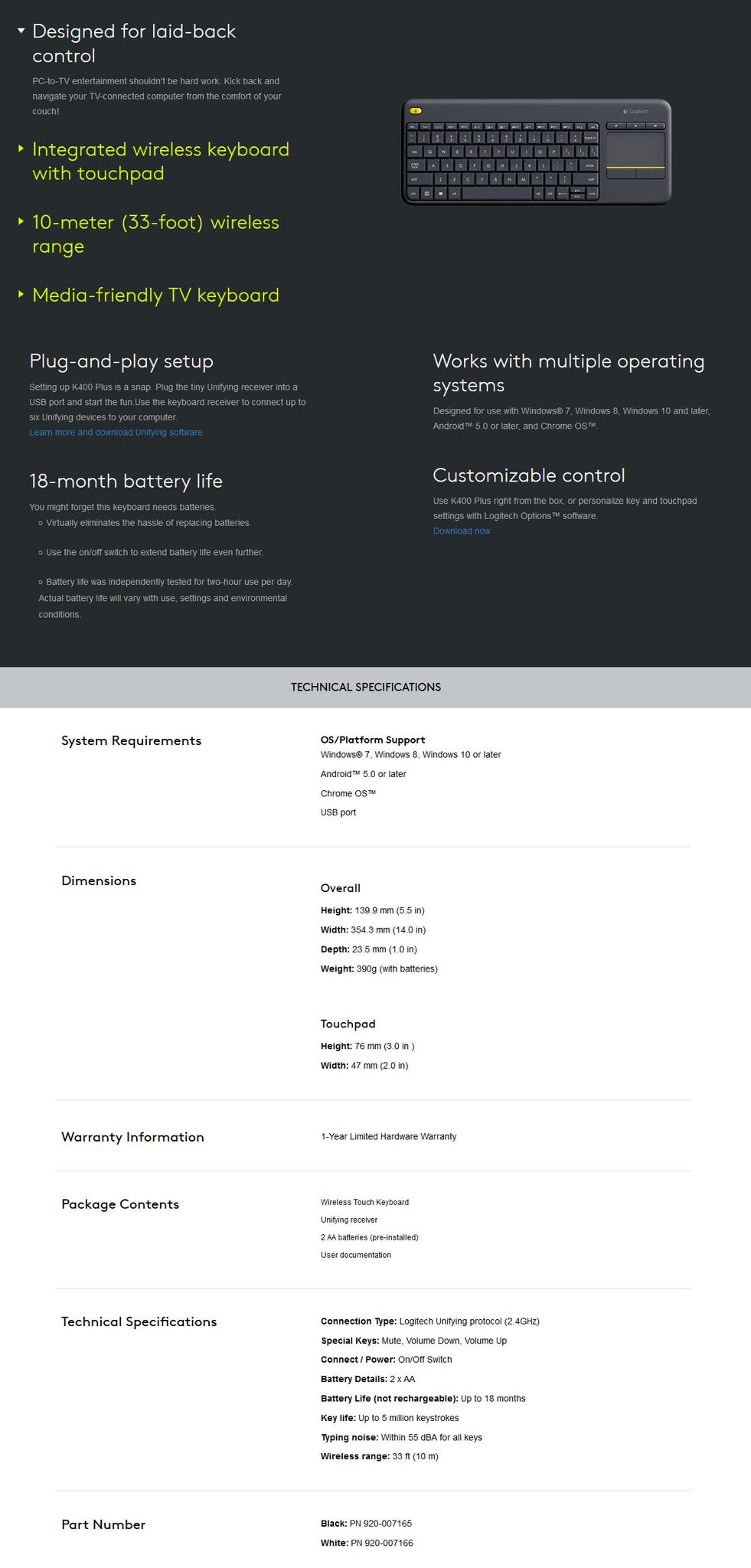 Logitech K400 PLUS Touch Wireless keyboard - Black (920-007165)